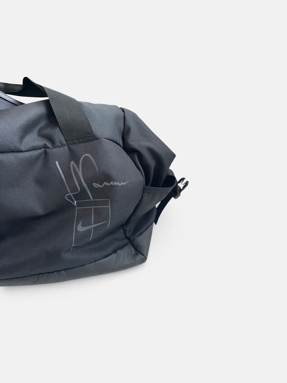 Signed black tennis bag used in match and for travel . Size to fit up to 5-6 rackets