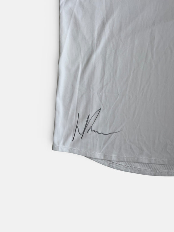 Signed Wimbledon match used T-shirt . White with liberty pattern inside neck , limited