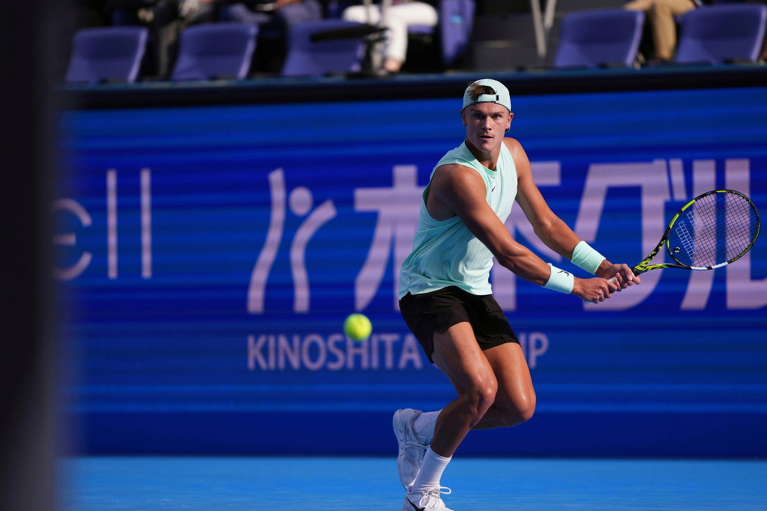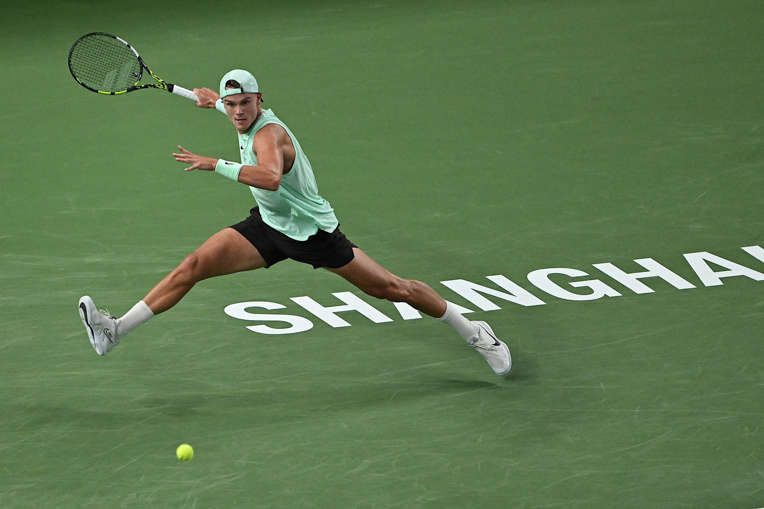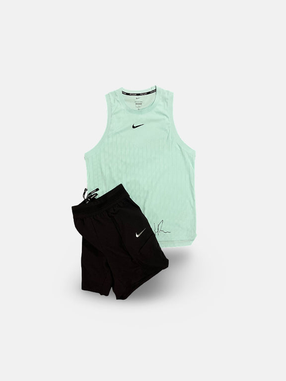 Signed match outfit, mint green sleeveless Shirt + brown shorts, used by Holger Rune at UsOpen, Tokyo and Shanghai masters , limited